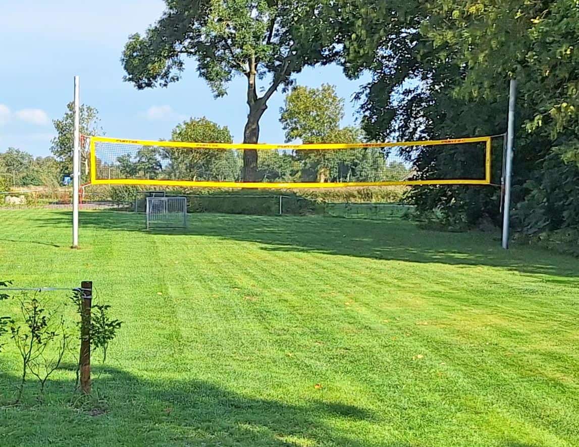 Op de camping is een volleybalveldje waar jong en oud samen sport en plezier beleven.