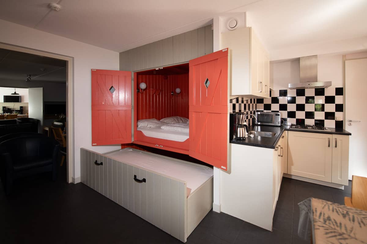 Het appartement is voorzien van een badkamer met een douche en toilet. Slaapkamer voor 3 personen en in woon/eetgedeelte is een bedstede gerealiseerd waar er ook nog slaapplaats is voor 2 a 3 personen. Keuken met magnetron,gaskookplaat, koelkast,vaatwasser.